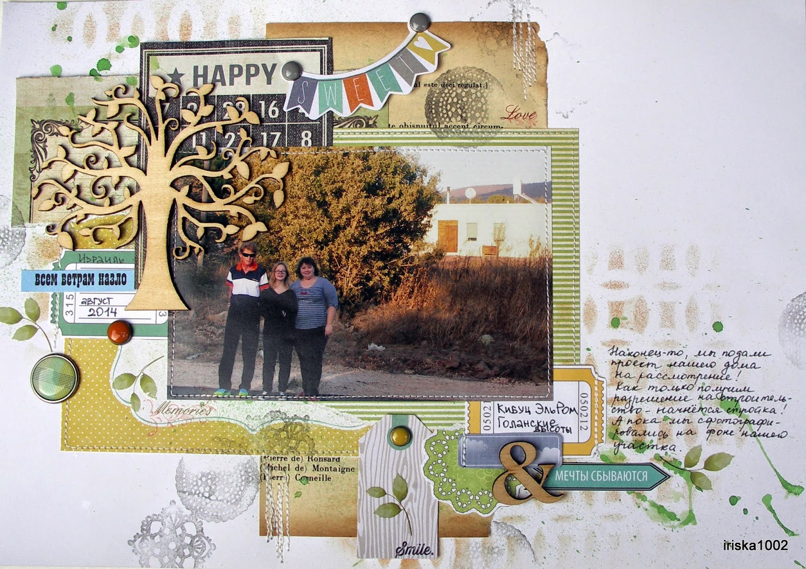 Моя страничка посвящена нашему новому месту жительства. Фотография сделана на фоне нашего участка, на котором скоро, я надеюсь, начнется строительство нашего дома. Так что мы счастливы и мечты движутся к исполнению, медленно, но верно и всем ветрам назло! Дерево, как символ того, что начало положено - это деревянная вырубка от КайзерКрафт, карточки для вырезания Scrapberrys Happy Birthday и вот эти, карточки-надписи от Елены Виноградовой про отпуск, фанерное украшение, брадс, маска, натирки, разные обрезки бумаги, разные штампы, спреи, страничка из книги, основа - альбомный лист.
